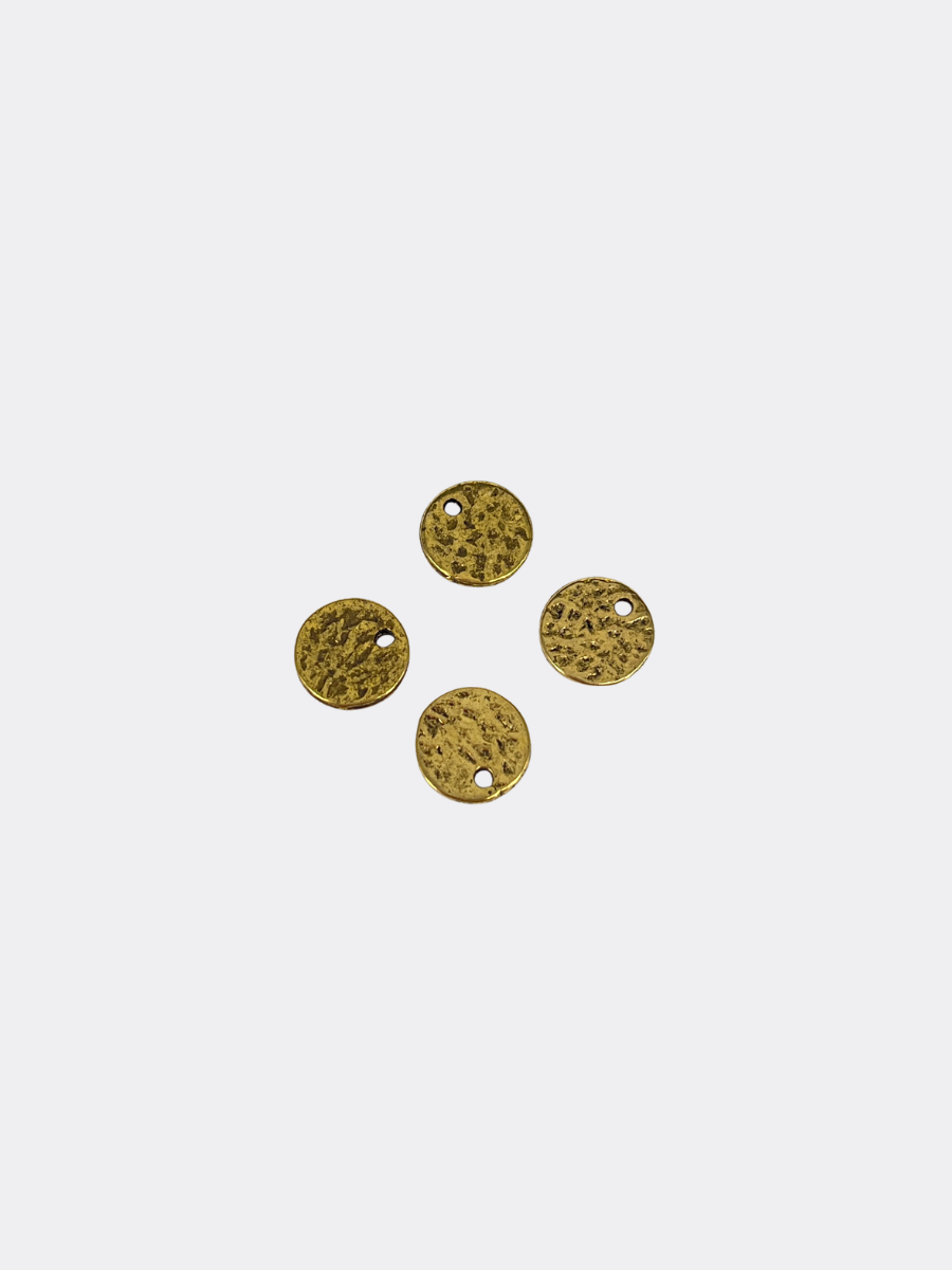 Moneta martellata con foro centrale. Realizzata in zama e prodotta in Italia. 10 mm.